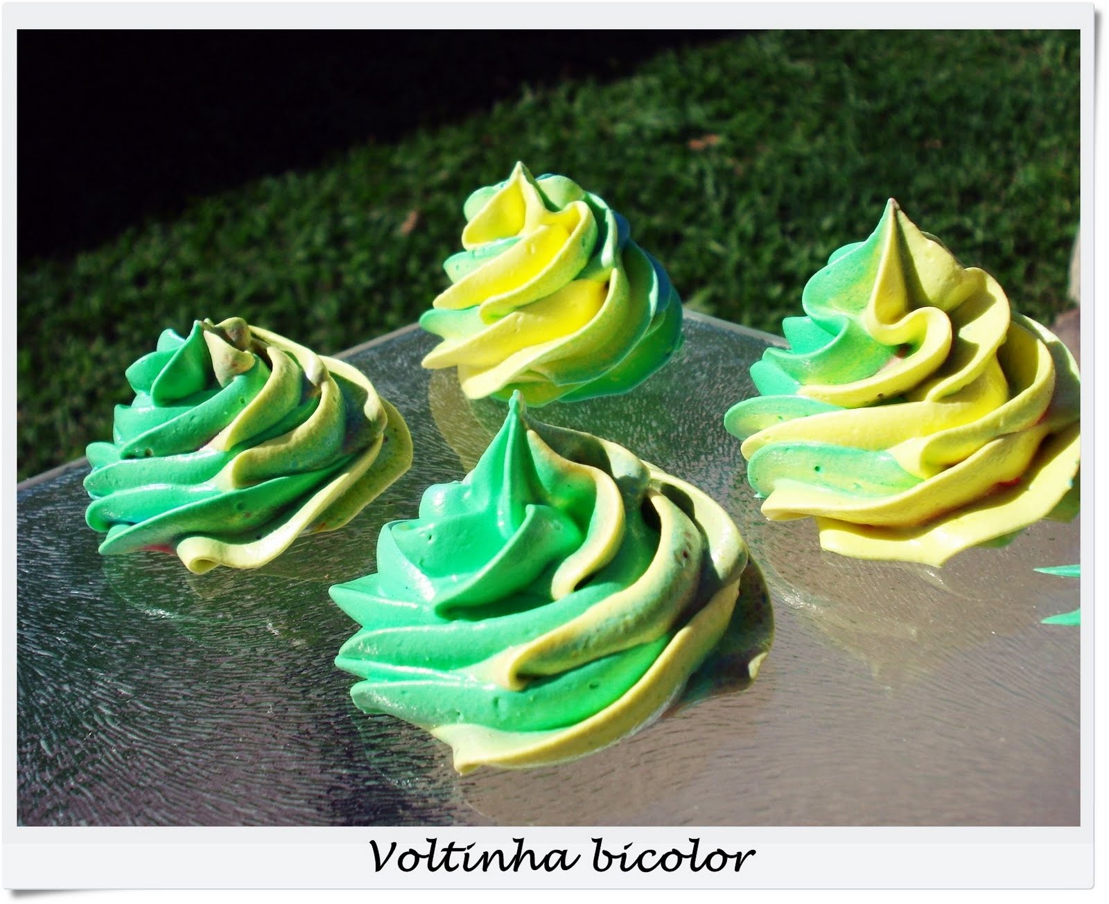 Cozinha é treino! E isso nós sabemos bem , né? Como eu sou muito exagerada fiz merengue italiano a beça na minha última receita. Quando ví aquela sobra toda logo quis fazer uns testes loucos! Eu sei que a copa acabou e foi um fiasco mas na realidade nem era para ser verde e amarelo e sim verde, amarelo, vermelho e azul. Bicolor eu sempre fiz e deu certo acho super fofo um voltinha rosinha e branca mas quando eu ví um de 4 cores me senti desafiada! Tá certo que no que eu ví era aparentemente buttercream e não merengue mas tudo bem... vamos ao teste. Eu fiz assim: